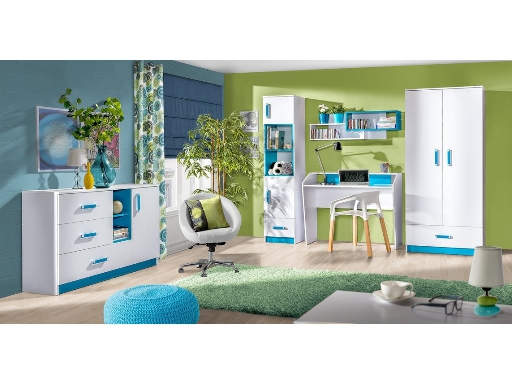Dvoudveřová šatní skříň TRAFICO ze sektorové řady, která se vyznačuje netradičním zpracováním barev a originalitou úchytů. Tento styl nábytku zaujme každou mladší generaci. Skříň je vyrobena z kvalitní LTD desky hraněné ABS lištou. Korpus i dveře jsou v bílé matné barvě doplněné barvou tyrkys. Uvnitř skříně je šatníková tyč a police, v dolní části je zásuvka. Sektorový nábytek TRAFICO má široký výběr prvků, který Vám zaručí sestavit si dětský nebo studentský pokoj, ložnici či kancelář podle svých potřeb, přání a představ. Dodáváme v demontovaném stavu.Doplňkové parametry