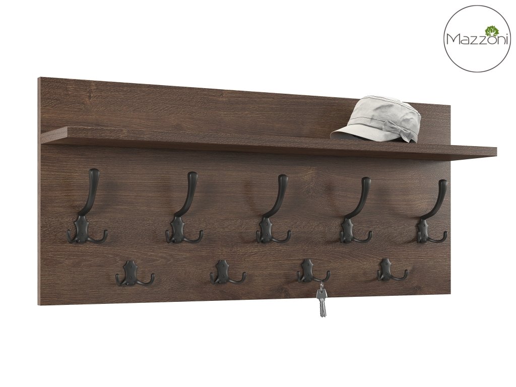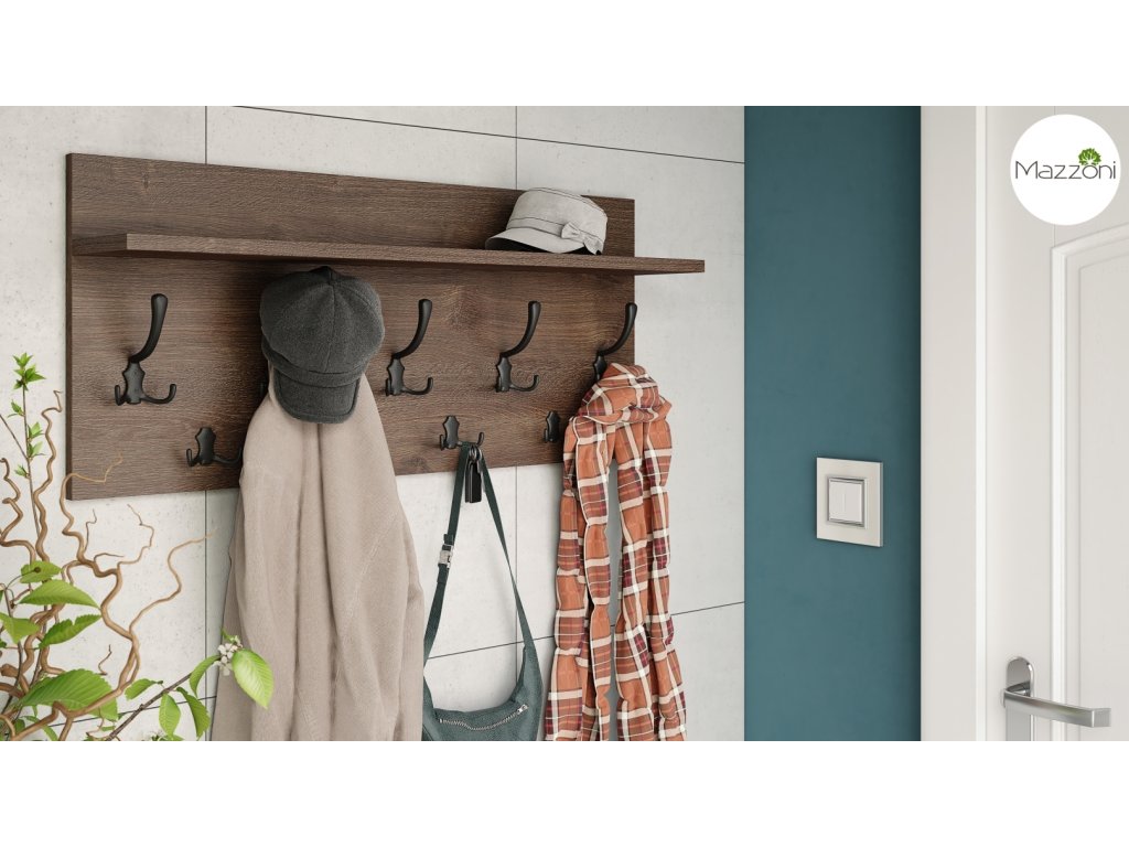 Elegantní věšák s praktickou policí zaujme dostatkem kovových věšáků (černý mat) pro větší množství oblečení. Je vyroben s kvalitní LTD 18 mm. Barevné provedení je hnědý dub.Doplňkové parametry