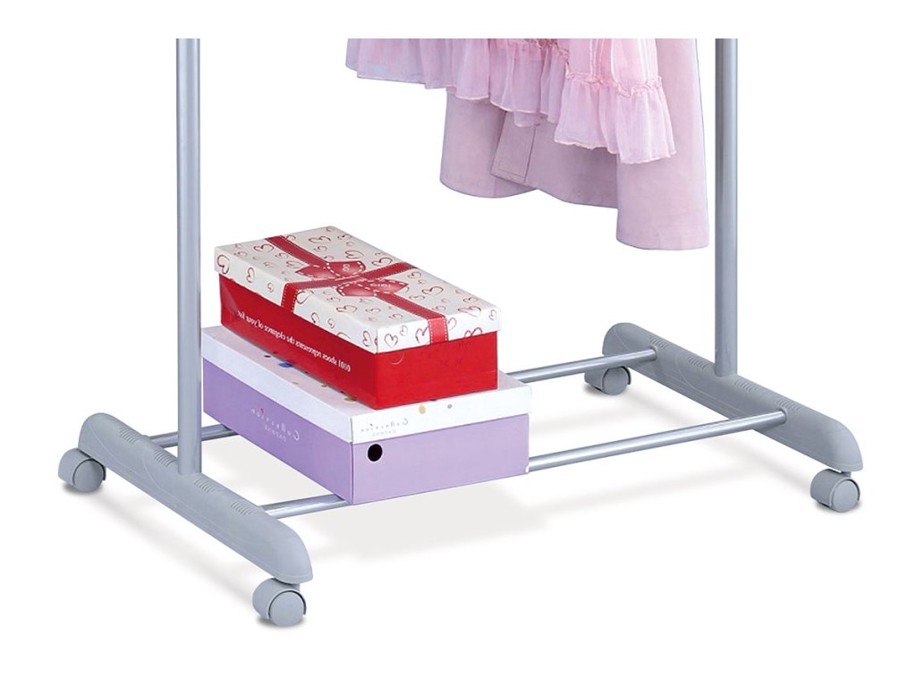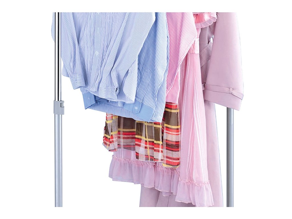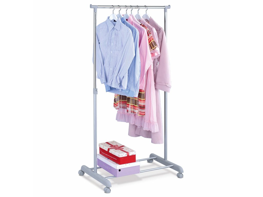 Jednoramenný stojan na šaty v šedém provedení kombinuje kovovou chromovanou tyč s plastovými prvky, což zajišťuje pevnost a stabilitu při zachování lehkosti. Výška stojanu je nastavitelná, což umožňuje přizpůsobení různým délkám oděvů. Spodní odkladač poskytuje praktický prostor pro uložení krabic nebo bot, čímž zvyšuje funkčnost a usnadňuje organizaci prostoru. Stojan je osazen kolečky pro snadnou manipulaci a přesun v interiéru. Je ideální pro dočasné i dlouhodobé zavěšení oděvů v domácnostech, obchodech či ateliérech.Doplňkové parametry