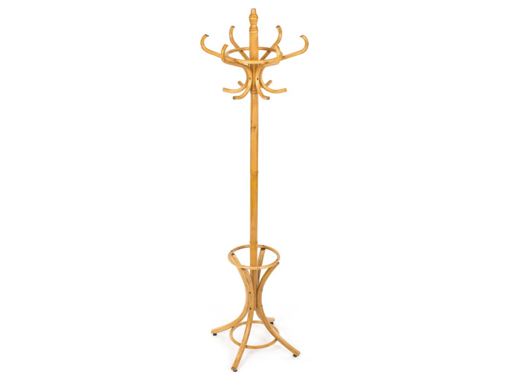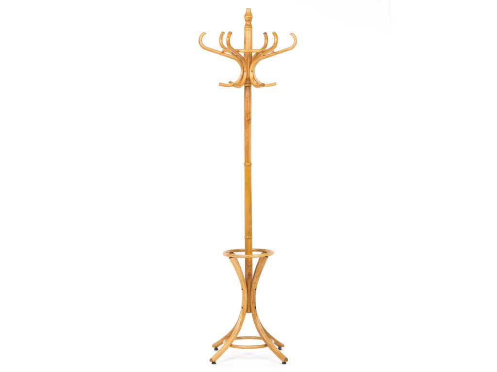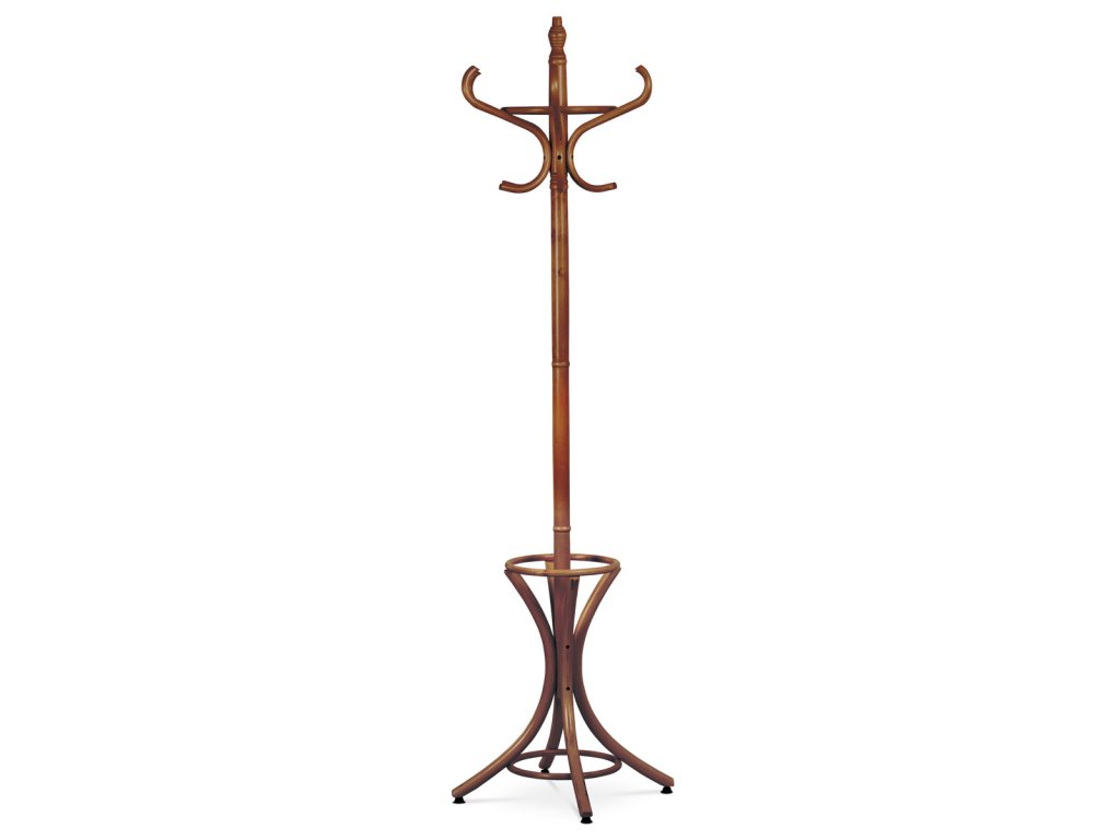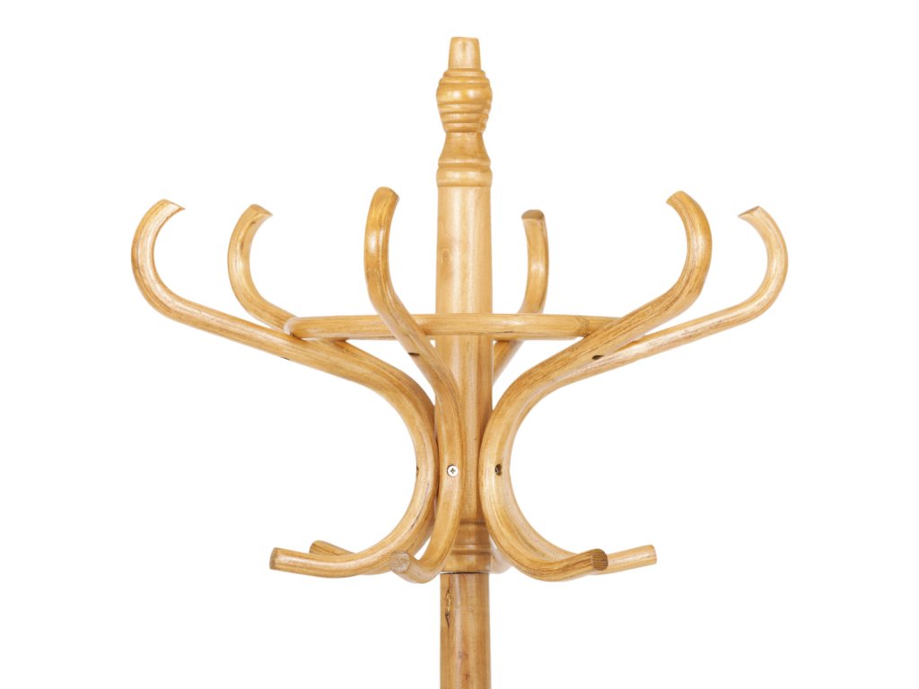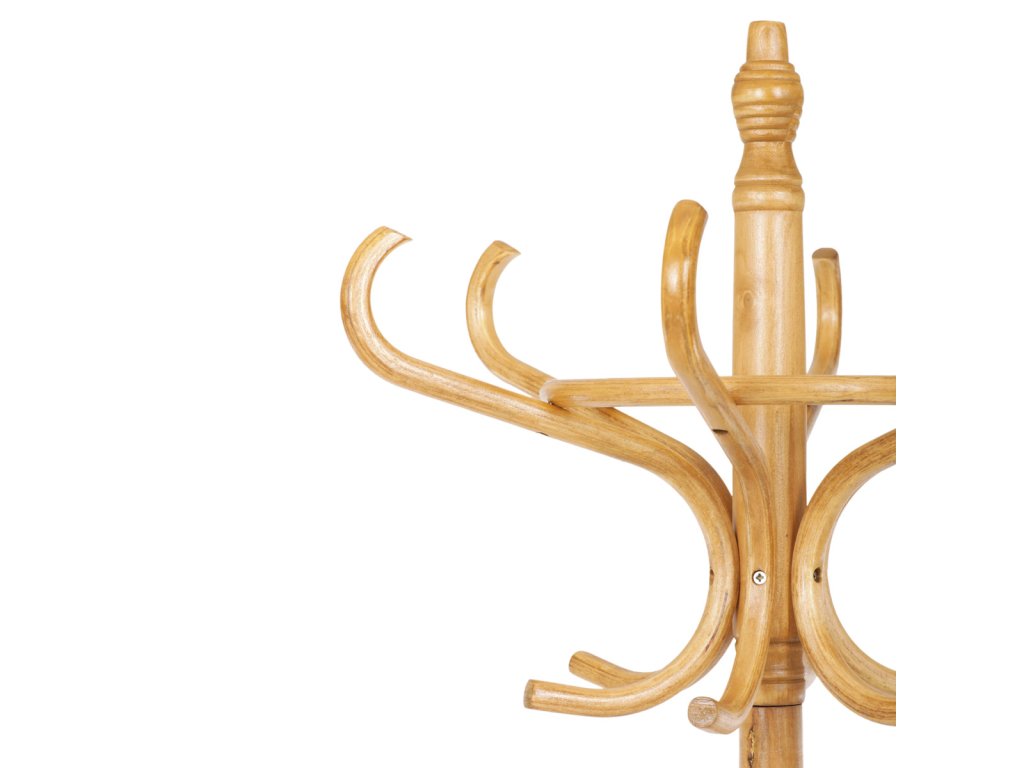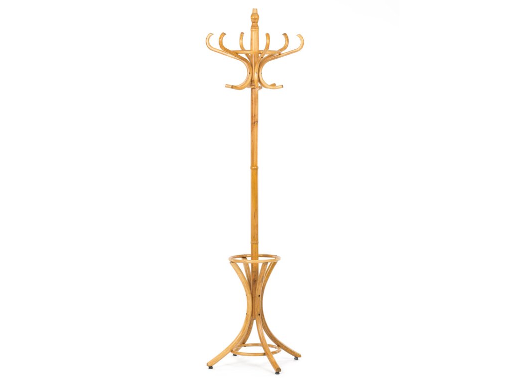 Dřevěný, volně stojící klasický věšák, resp. bestseller mezi věšáky. S jeho desingem se setkáváme již několik generací a jeho obliba je nadčasová. O tom svědčí i fakt, že ke svému původnímu účelu - a to věšení oblečení, začal sloužit i jako součást umění. Setkáváme se s ním např. v galeriích a výstavních prostorách, kde ho vidíme jako stojan na zavěšení obrazů nebo je dekorován živými či umělými květy nebo plastikami. Vyrobený je z ohýbaného topolového dřeva, nosná tyč je z břízy, mořený je v odstínu medový dub a lakovaný transparentním lakem. Výška 185 cm, nosnost je 12 kg rovnoměrné zátěže.Doplňkové parametry