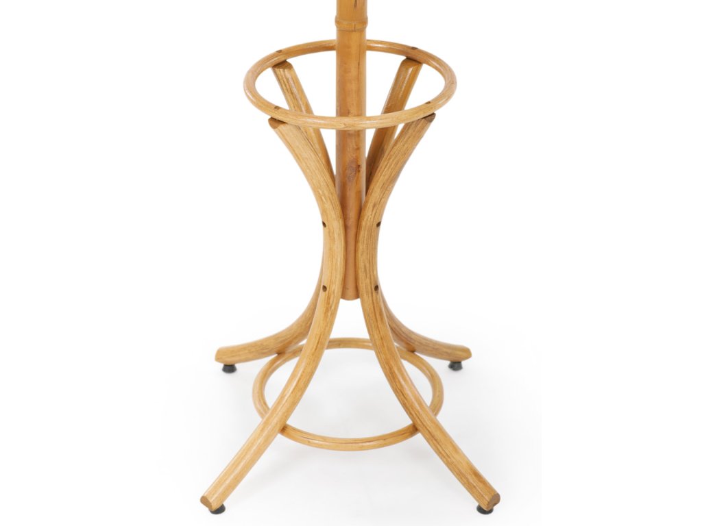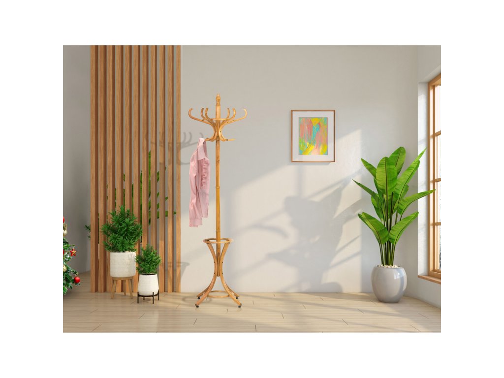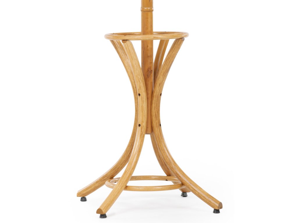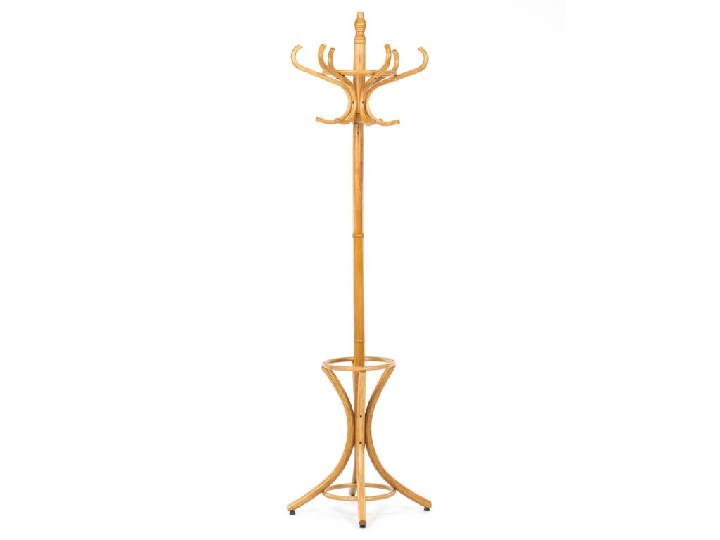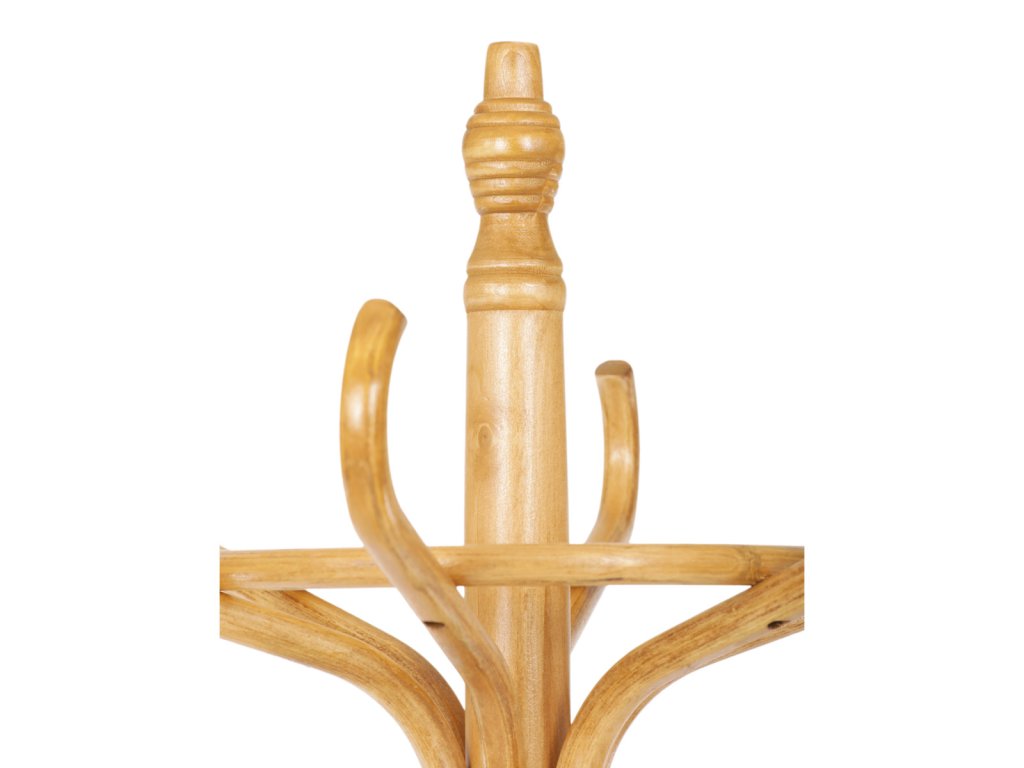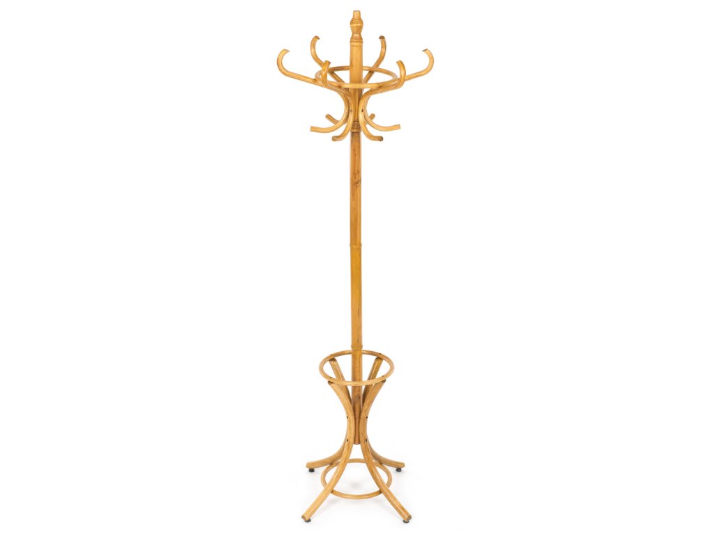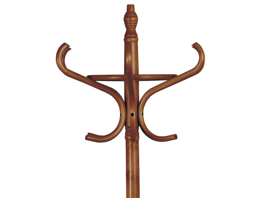 Dřevěný, volně stojící klasický věšák, resp. bestseller mezi věšáky. S jeho desingem se setkáváme již několik generací a jeho obliba je nadčasová. O tom svědčí i fakt, že ke svému původnímu účelu - a to věšení oblečení, začal sloužit i jako součást umění. Setkáváme se s ním např. v galeriích a výstavních prostorách, kde ho vidíme jako stojan na zavěšení obrazů nebo je dekorován živými či umělými květy nebo plastikami. Vyrobený je z ohýbaného topolového dřeva, nosná tyč je z břízy, mořený je v odstínu medový dub a lakovaný transparentním lakem. Výška 185 cm, nosnost je 12 kg rovnoměrné zátěže.Doplňkové parametry