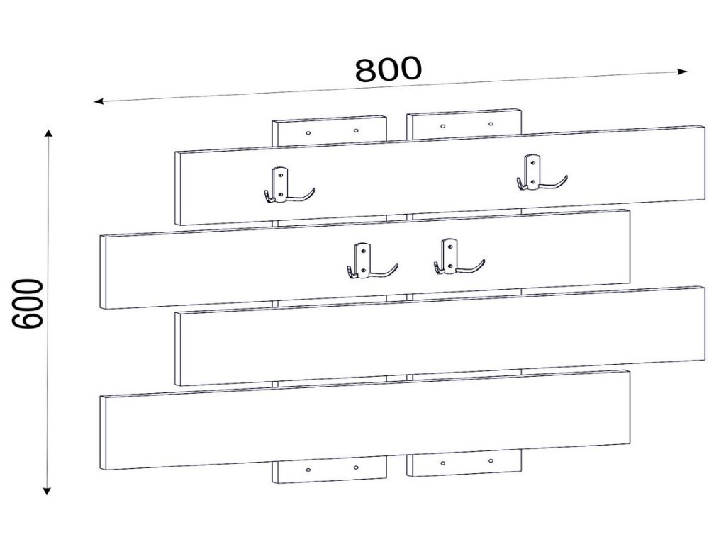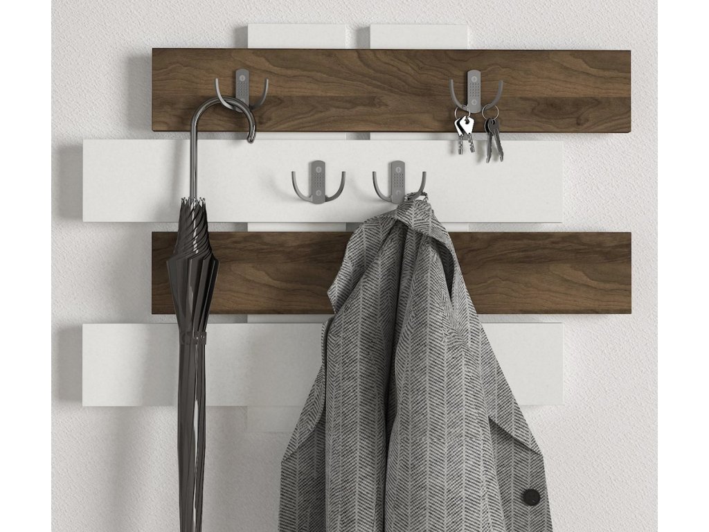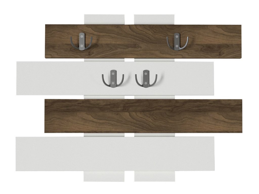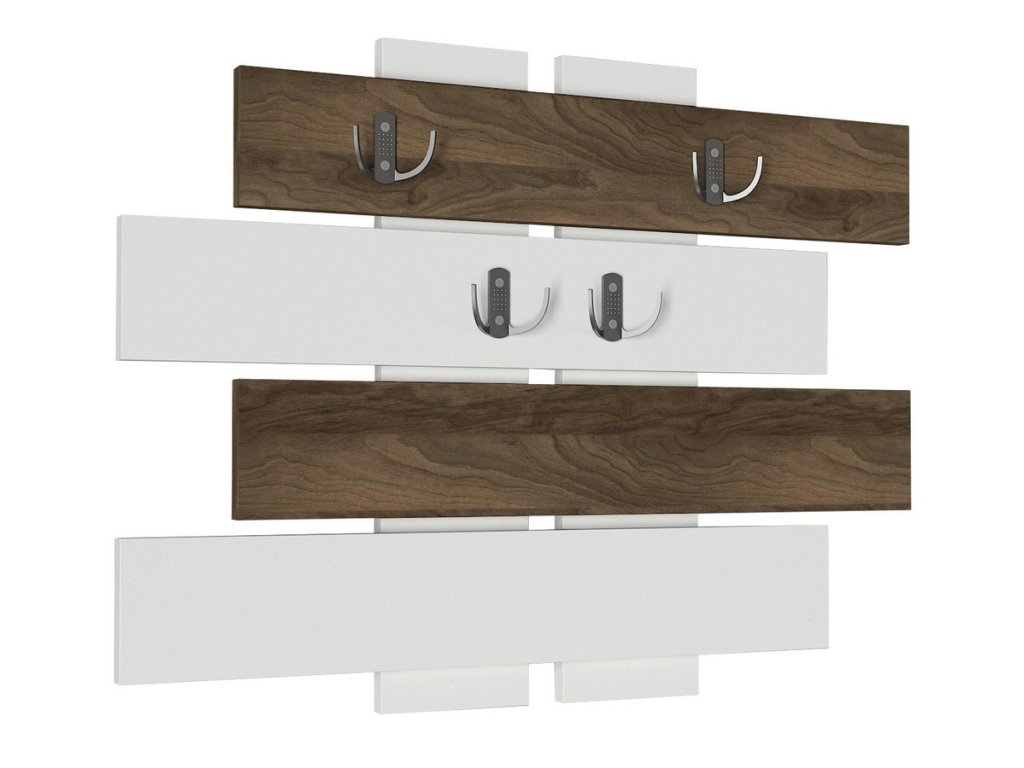 Nástěnný věšák je vyroben z kvalitního lamina o tl.18 mm hraněné PVC páskou, odolného proti poškrábání v kombinaci barev matná bílá/ořech vlašský. Dodáváme v demontovaném stavu.Doplňkové parametry