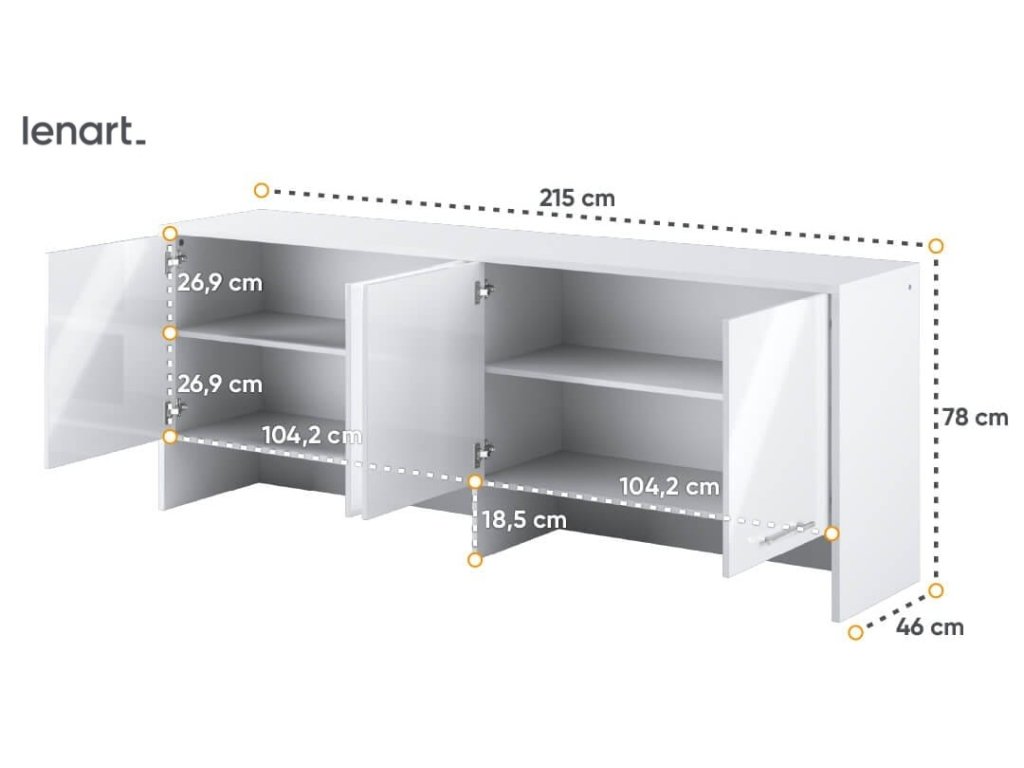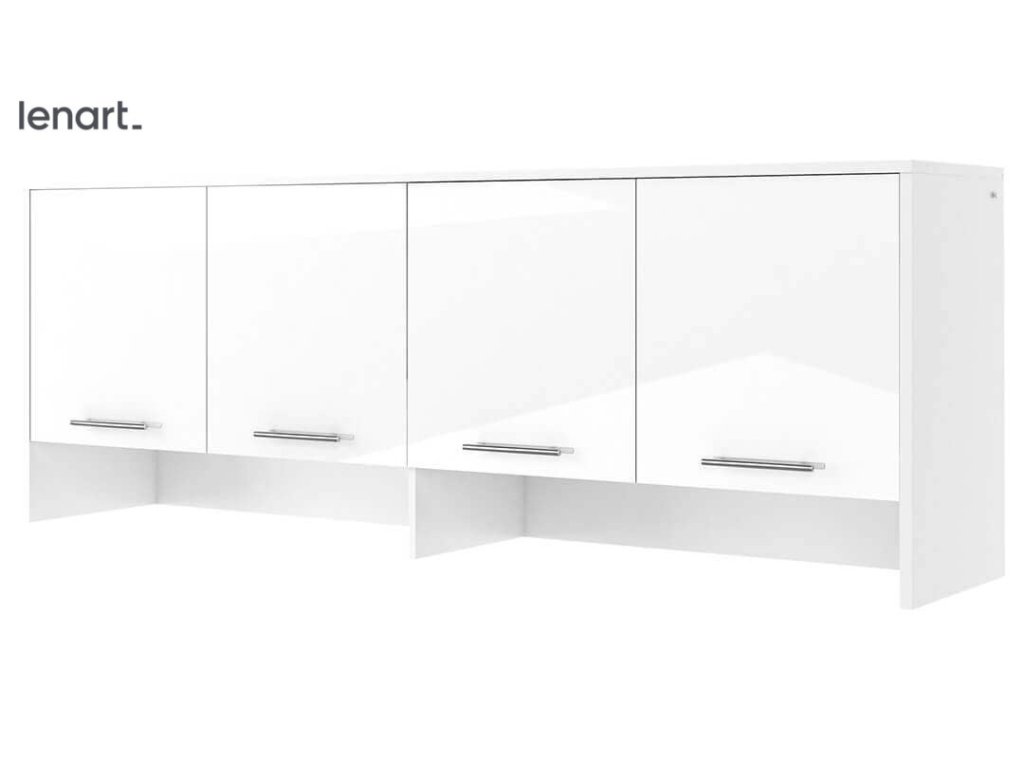Nádstavec bílá lesk k výklopné posteli ze sektoru CONCEPT PRO. Rozměry viz obrázek. Nádstavec má 4 dvířka. Nábytek je vyroben z kvalitního lamina s ABS hranou. Korpus je v bílé matné barvě a dvířka jsou v bílém lesku. Lamino je odolné proti poškrábání, poškození, vlhkosti a vysokým teplotám. Dodáváme v demontovaném stavu.Doplňkové parametry