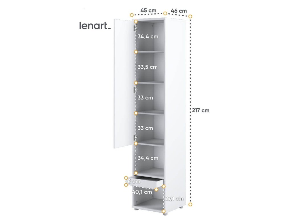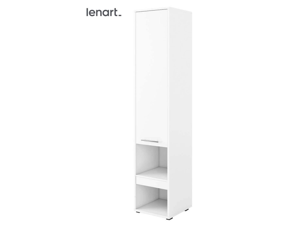Skříňka bílá matná. Skříňka má 1 dvířka a pod nimi dvě poličky. Nábytek je vyroben z kvalitního lamina s ABS hranou. Lamino je odolné proti poškrábání, poškození, vlhkosti a vysokým teplotám. Vhodně doplňuje naše vertikální výklopné postele ze stejného sektoru. Dodáváme v demontovaném stavu.Doplňkové parametry