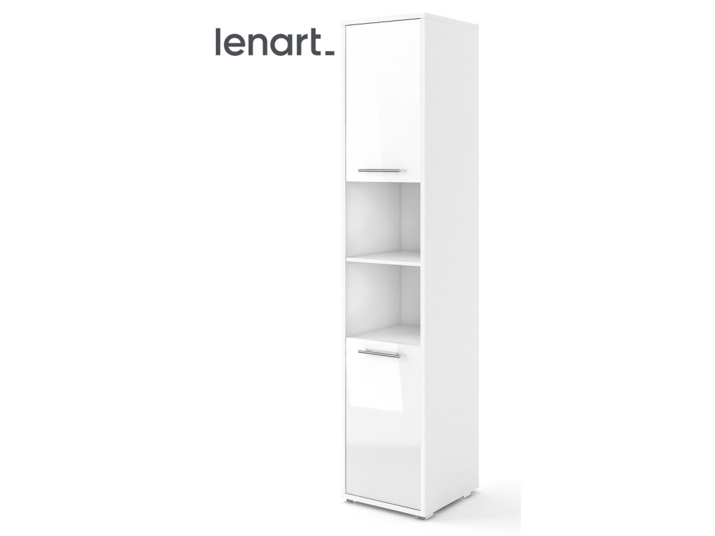 Skříňka bílá lesk. Skříňka má 2 dvířka a uprostřed dvě poličky. Nábytek je vyroben z kvalitního lamina s ABS hranou. Korpus je v bílé matné barvě a dvířka jsou v bílém lesku. Lamino je odolné proti poškrábání, poškození, vlhkosti a vysokým teplotám. Vhodně doplňuje naše vertikální výklopné postele ze stejného sektoru. Dodáváme v demontovaném stavu.Doplňkové parametry