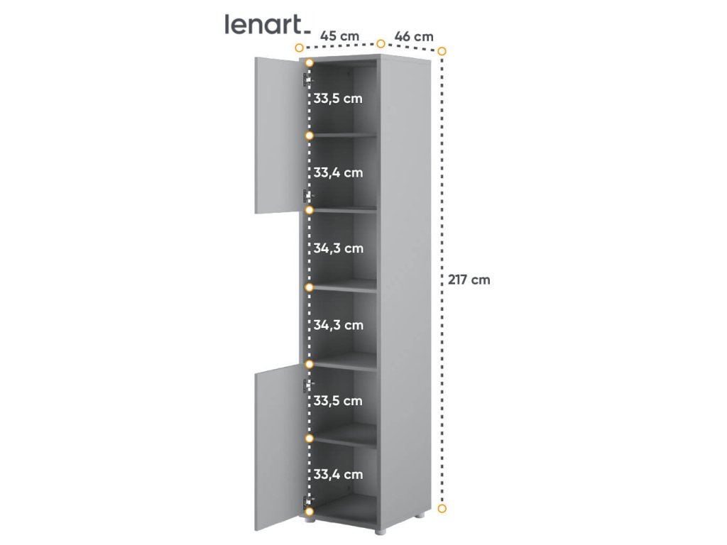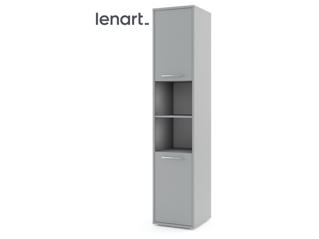 Skříňka šedá. Skříňka má 2 dvířka a uprostřed dvě poličky. Nábytek je vyroben z kvalitního lamina s ABS hranou. Lamino je odolné proti poškrábání, poškození, vlhkosti a vysokým teplotám. Vhodně doplňuje naše vertikální výklopné postele ze stejného sektoru. Dodáváme v demontovaném stavu.Doplňkové parametry