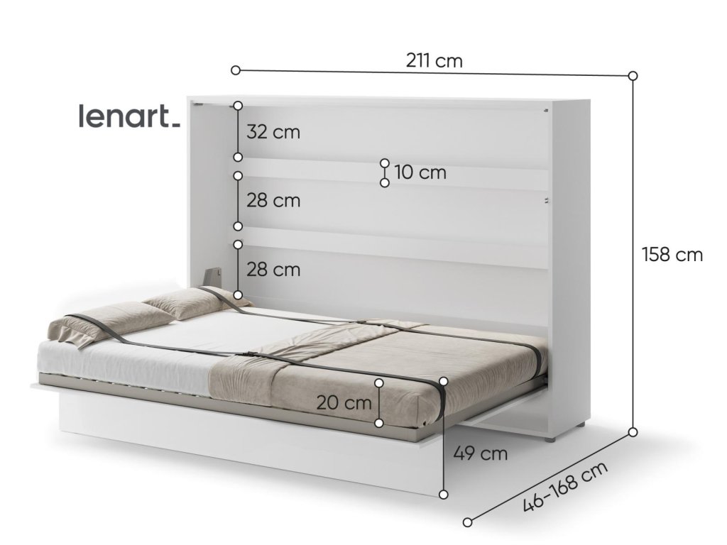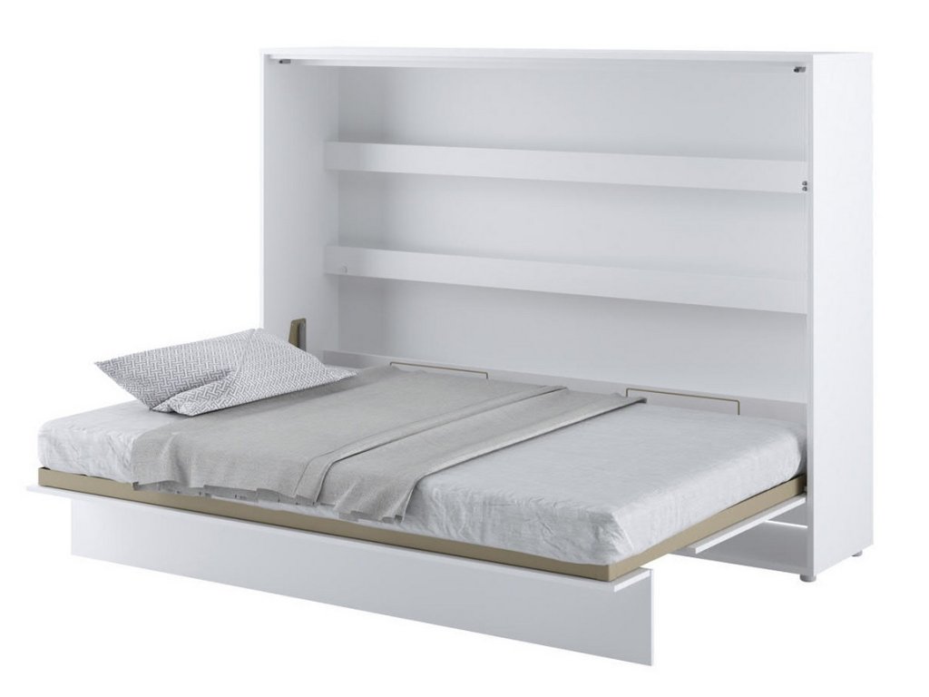 Široká výklopná postel 140 bílá mat. Rozměry viz obrázek. Se sklápěcí postelí Vás už nebude trápit malý prostor Vaší domácnosti. Díky stabilní konstrukci zaručuje pohodlný odpočinek. Pneumatický mechanismus sklápění postele zajistí bezpečné otevírání a je doplněn SOFT CLOSE systémem tichého zavírání. Tento výjimečný systém Vám umožní manipulaci pouze jedním prstem. Když je postel sklopená, vypadá jako běžná skříň. Vyklopením se vytáhne celá šířka postele. Při lozložení postele má hloubku 168 cm. Uvnitř skříně jsou praktické police na knížky nebo dekorační předměty, vše máte na dosah ruky. Maximální zatížení polic je 5 kg. Rám je nutno přišroubovat ke zdi, nosnost postele je 200 kg. Rošt postele je v ceně, matrace není součástí, je potřeba ji dokoupit. Doporučujeme velikost 140 x 200 x výšku do 18 cm. Po sklopení postele vzniká prostor pod postelí o výšce 24,9 cm. Nábytek je vyroben z kvalitního lamina s ABS hranou. Lamino je odolné proti poškrábání, poškození, vlhkosti a vysokým teplotám. Postel nabízíme v několika velikostech a barevných provedeních. K posteli je možné dokoupit LED osvětlení. Dodáváme v demontovaném stavu. Můžete si prohlédnout prezentační video, klikněte ZDE.Doplňkové parametry