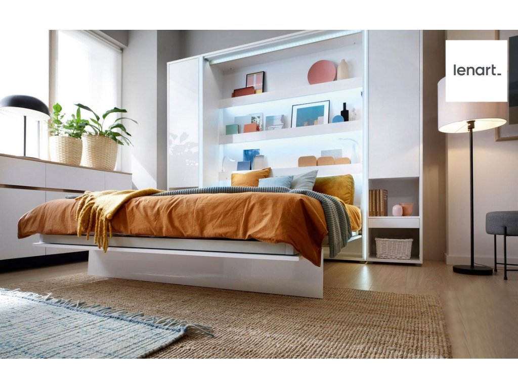 Široká výklopná postel 160 bílá lesk/bílá mat. Rozměry viz obrázek. Se sklápěcí postelí Vás už nebude trápit malý prostor Vaší domácnosti. Díky stabilní konstrukci zaručuje pohodlný odpočinek. Pneumatický mechanismus sklápění postele zajistí bezpečné otevírání a je doplněn SOFT CLOSE systémem tichého zavírání. Tento výjimečný systém Vám umožní manipulaci pouze jedním prstem. Když je postel sklopená, vypadá jako běžná skříň. Vyklopením se vytáhne celá šířka postele. Při lozložení postele má hloubku 188 cm. Uvnitř skříně jsou praktické police na knížky nebo dekorační předměty, vše máte na dosah ruky. Maximální zatížení polic je 5 kg. Rám je nutno přišroubovat ke zdi, nosnost postele je 200 kg. Rošt postele je v ceně, matrace není součástí, je potřeba ji dokoupit. Doporučujeme velikost 160 x 200 x výšku do 18 cm. Po sklopení postele vzniká prostor pod postelí o výšce 24,9 cm. Nábytek je vyroben z kvalitního lamina s ABS hranou. Lamino je odolné proti poškrábání, poškození, vlhkosti a vysokým teplotám. Postel nabízíme v několika velikostech a barevných provedeních. K posteli je možné dokoupit LED osvětlení. Dodáváme v demontovaném stavu. Můžete si prohlédnout prezentační video, klikněte ZDE.Doplňkové parametry