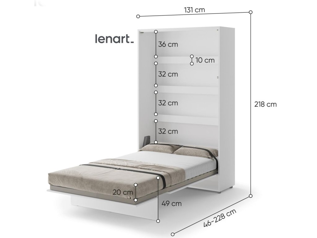 Vysoká výklopná postel 120 bílá mat. Rozměry viz obrázek. Se sklápěcí postelí Vás už nebude trápit malý prostor Vaší domácnosti. Díky stabilní konstrukci zaručuje pohodlný odpočinek. Pneumatický mechanismus sklápění postele zajistí bezpečné otevírání a je doplněn SOFT CLOSE systémem tichého zavírání. Tento výjimečný systém Vám umožní manipulaci pouze jedním prstem. Když je postel sklopená, vypadá jako běžná skříň. Při lozložení postele má hloubku 228 cm. Vyklopením se vytáhne celá délka postele. Uvnitř skříně jsou praktické police na knížky nebo dekorační předměty, vše máte na dosah ruky. Maximální zatížení polic je 5 kg. Rám je nutno přišroubovat ke zdi, nosnost postele je 150 kg. Rošt postele je v ceně, matrace není součástí, je potřeba ji dokoupit. Doporučujeme velikost 120 x 200 x výšku do 18 cm. Po sklopení postele vzniká prostor pod postelí o výšce 24,9 cm. Nábytek je vyroben z kvalitního lamina s ABS hranou. Lamino je odolné proti poškrábání, poškození, vlhkosti a vysokým teplotám. Postel nabízíme v několika velikostech a barevných provedeních. K posteli je možné dokoupit LED osvětlení. Dodáváme v demontovaném stavu. Můžete si prohlédnout prezentační video, klikněte ZDE.Doplňkové parametry